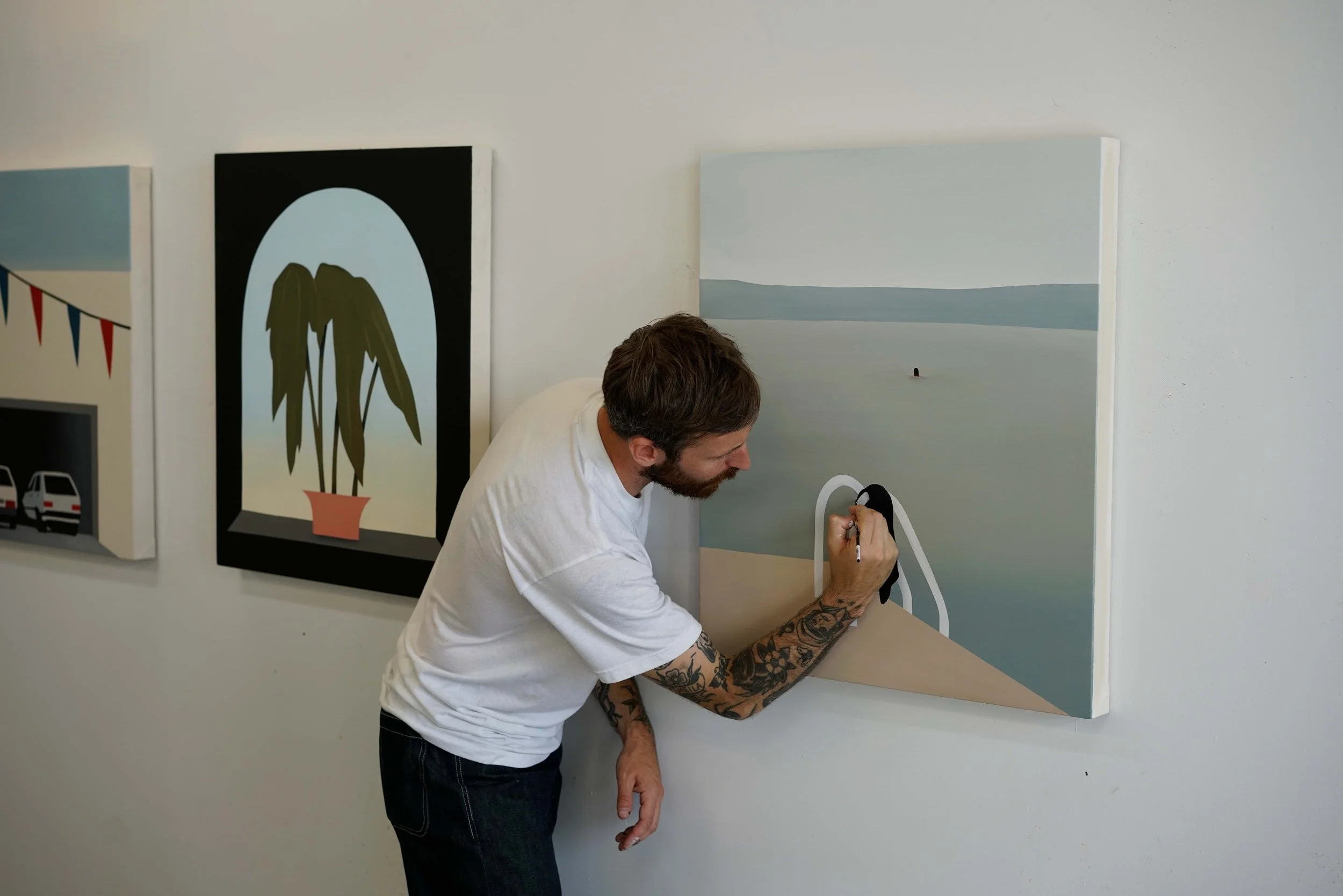 The work of painter Dan Climan depicts everyday scenes with an underlying uncanniness, exploring the tension between the familiar and the unknown. Both stylistically and thematically, Climan’s oeuvre draws from mid-century cinema, photography, and advertising. His paintings invoke the era’s non-digital simplicity with flat, clean-edged forms and wide-open compositions; their sparse canvases are populated with common objects and nostalgic figures — radiators, barns, dogs — that feel eerily out-of-place. Like a frame from an old film or a snapshot taken from a car window, Climan’s works capture fleeting moments-in-time: emotive, unresolved narratives that ask the viewer to draw their own conclusions.